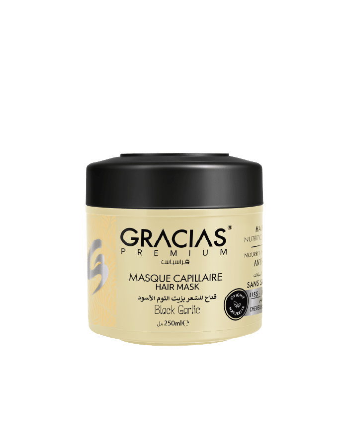 Le Masque capillaire a l’ail noir de GRACIAS est un soin intense qui nourrit en profondeur, répare et fortifie les cheveux cassants de la racine jusqu’aux pointes.